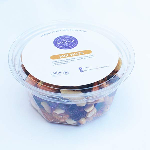 Almendras, castañas de cajú, castañas do pará, maní tostado, uvas pasas y nuez mariposa.